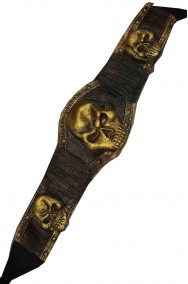 Per completare un costume da vichingo ma anche per un costume di halloween da guerriero voodoo questo cinturone con teschi molto grande. Il cinturone e' di gomma morbida, la parte decorata (che resta davanti) e' lunga 65cm e poi prosegue, per essere legato dietro, con un nastro di stoffa per un totale di 130 cm.