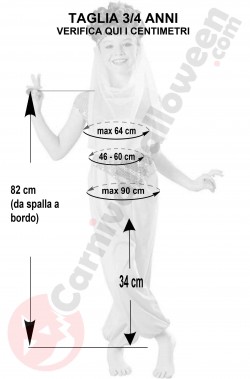 Classico vestito di carnevale per bambina da araba delle favole e delle leggende del deserto questo costume da danzatrice del ventre e' una tuta unica quindi ti raccomandiamo di verificare bene le misure in centimetri nella foto in bianco e nero qui nella scheda prodotto prima di acquistare con particolare attenzione alla lunghezza ed al cavallo. La fascia intorno alla pancia e' color carne per conferire al costume l'effetto due pezzi. Un ottimo prodotto anche per interpretare la principessa Jasmine di Aladdin