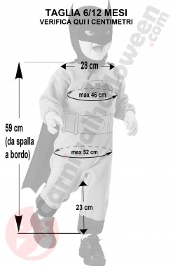 Questo vestito di carnevale da Batman include la tuta intera con il mantello col copricapo a maschera che si lega sotto al mento ma non solo: la tuta si apre sotto al cavallo con dei bottoni a pressione per cambiare il pannolino senza problemi e senza dover svestire il bambino. Tra i costumi di carnevale per neonati questo costume da bambino di Batman fara' subito diventare il tuo bambino un Cavaliere Oscuro senza macchia e senza paura che combatte il male e difende il bene, regalagli questo vestito da Batman. Lo usera' non solo a carnevale ma anche per giocarci ogni giorno.