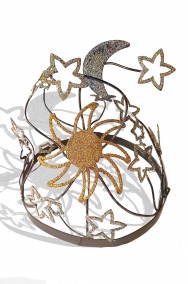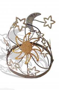 Realizzata in metallo, con il cerchio regolabile a innesto, questa stupenda corona da principessa e' rifinita con un sole giallo oro, la luna argento e tante stelle il tutto coperto di brillantini che rendono questo prodotto perfetto sia come corona da principessa che come corona da maga o strega ma anche come corona da sirena.