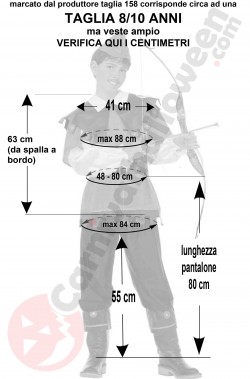 Include la giacca con il collare merlato medievale, la finta camicia (maniche e colletto), i pantaloni con copristivali uniti, la cintura ed il cappello. L'arco NON è incluso ma alcuni archi sono acquistabili separatamente per trasformare il vestito in un costume medievale da arciere completo di tutto.