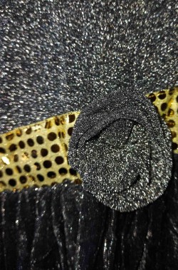 Composto dall'abito color argento con la grande rosa argentata e le ampie fasce dorate di paillettes, la fascia per capelli dorata di paillettes con la piuma nera ed i guanti argento senza dita e' un bel vestito da festa.