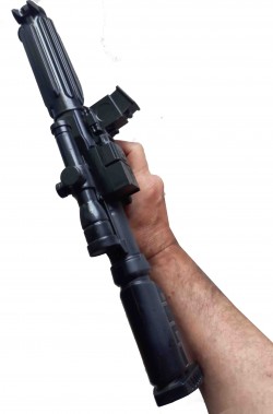 La forma del fucile con il caricatore laterale (statico, non rimuovibile) e' simile a quella dei mitra Stenmark della seconda guerra mondiale molto originale.