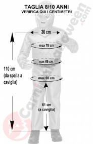 Disponibile in un'unica taglia, dichiarata dal produttore 8 10 anni, ti raccomandiamo di non fidarti dell'eta' bensì' di misurare il bambino e confrontare le sue misure in centimetri con quelle che trovi qui nella foto in bianco e nero sotto alla foto principale e che abbiamo misurato per te sul costume a nostro magazzino perche' il costume ha una vestibilita' stretta e non e' elasticizzato. E' indicato a bambini longilinei.
