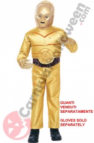 Trasforma il tuo bimbo nel piu' famoso droide protocollare della storia della fantascienza con questo costume di D3BO, il robot dorato di Star Wars, amico fraterno di C1P8. Composto dalla tuta dorata con un bell'effetto a due strati tra la parte superiore e quella inferiore, e dalla maschera solo anteriore con il cappuccio e' uno dei personaggi piu' amati della saga di George Lucas ambientata nella galassia lontana lontana.