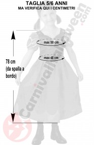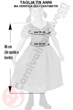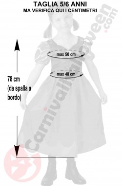 Questo bellissimo vestito di carnevale di Anna originale Disney include l'abito che veste abbastanza stretto quindi vi raccomandiamo di misurare la bambina e confrontare i suoi centimetri con quelli che trovate qui nelle foto in bianco e nero con le misure che abbiamo preso per voi sul costume in nostro magazzino. Tenete presente che spesso lo stesso costume, stesso produttore, stessa taglia a seconda del paese di importazione può variare di diversi centimetri quindi qui avete la garanzia della misura perche' abbiamo misurato noi. Non fidatevi delle taglie. Guardate i centimetri.