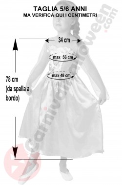 Per la taglia non ti fidare: misura la bambina o un vestito della bambina e confronta i centimetri con quelli che trovi qui nella foto in bianco e nero che abbiamo preso noi sull'abito a nostro magazzino. Fallo PRIMA di ordinare perche' prevenire e' meglio che curare.