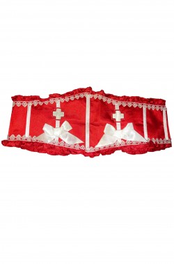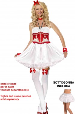 Il prodotto include la sottoveste bianca con la parte superiore regolabile con il nastrino incrociato a criss cross, il corsetto rosso con le stecche ed il criss cross sulla schiena, i guantini, l'ampia sottogonna vaporosa bianca millebalze ed i guantini con la croce. Il costume da crocerossina e' completato poi da due nastrini, uno per fare il fiocco nei capelli e l'altro da legare al collo.