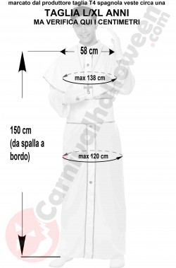 Il prodotto e' ovviamente un prodotto carnevalesco ed e' fabbricato in una taglia standard denominata taglia unica T4 dal produttore che ha una ampia vestibilita': come puoi vedere dalla foto in bianco e nero con i centimetri precisi e' circa una taglia L / XL ma, per un uso divertente carnevalesco, può essere indossato anche da una M, ovviamente resta piu' largo su spalle e torace ma c'e' comunque la mantellina a coprire la parte superiore.