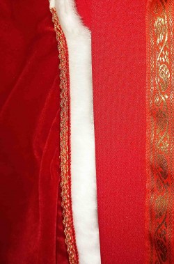 Richiama gli abiti dei Papi del medioevo, i grandi papi storici perche' ha anche la mantella coprispalle con il bordo di pelliccia finta bianca a impreziosire il costume questo bellissimo vestito da Papa Borgia o anche da Cardinale d'epoca.