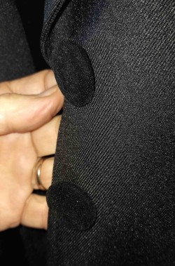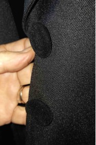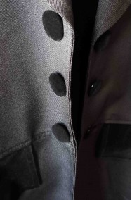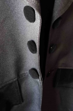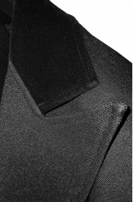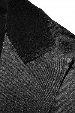 Il costume include: la giacca nera da uomo a frac senza code lunga elegante sempre aperta con 4 bottoni (senza asole) grandi rivestiti di velluto di poliestere, i polsi ed il revere di velluto di poliestere e le finte tasche con la patella di velluto di poliestere molto elegante, il pantalone di tessuto spesso con le pences, elastico in vita per tutta la circonferenza per un maggior comfort (senza cerniera), finta camicia a sparato da indossare sotto all'ultimo pezzo incluso ovvero il finto gilet nero di velluto di poliestere.