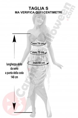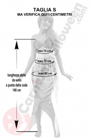 Per l'animazione di una festa bambini o per un gruppo di carnevale a tema principesse Disney un costume di carnevale della Sirenetta adulta che non passera' inosservato ed e', soprattutto, completo perche' include il vestito in un corpo unico (la pancia e' coperta dal tessuto color carne) e dalla stupenda parrucca lunga rossa proprio con la tonalita' di Ariel.