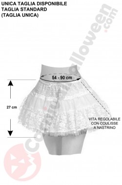 La camicia e' in taglia M, la sottogonna e' regolabile con coulisse a cordino in vita. Calze monotaglia adulto.