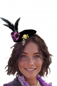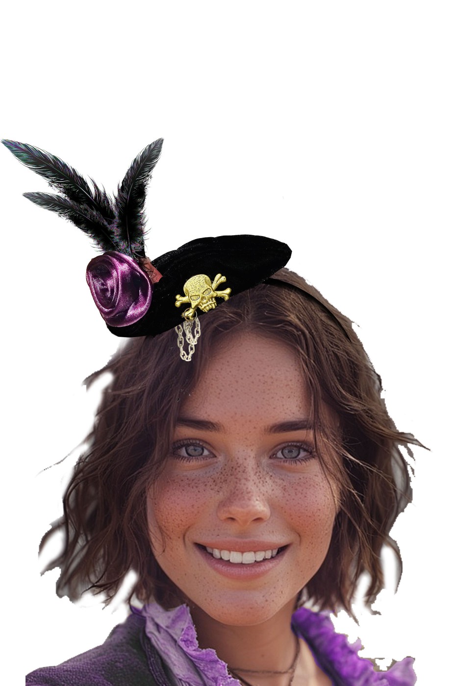 Delizioso cappellino da piratessa di tessuto vellutato montato su cerchietto con il teschio con le ossa incrociate, il cosiddetto Jolly Roger, la catenella, le piume e l'elegantissima rosa viola.