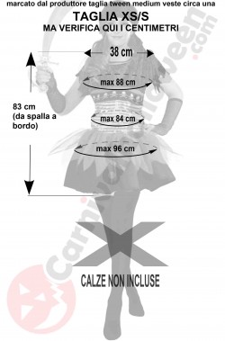 ATTENZIONE: LA FOTO DELL'ETICHETTA DEL PRODOTTO MOSTRA IL COSTUME INDOSSATO DA UNA RAGAZZINA. IL PRODOTTO IN REALTA' VESTE UNA TAGLIA ADULTA XS S MA NON TI FIDARE: misurati con cura e confronta le tue misure con quelle riportate qui nella foto in bianco e nero che abbiamo preso noi sul costu,e
