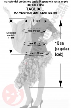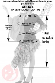 Include il vestito con la parte terminale asimmetrica a balze coloratissime e la mantella con l'interno giallo e l'esterno rosa in nuance con le coloratissime balze della gonna questo costume da spagnola adulta prodotto in Spagna e non in Cina.