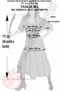 Questo costume da piratessa rosso include l'abito lungo, la fascia e la bandana. La taglia e' dichiarata M dal produttore ma come puoi vedere dai centimetri nella foto in bianco e nero in questa pagina in realta' ha un'ampia vestibilita' quindi per noi veste anche una taglia L. Non ti fidare della taglia pero': misurati e confronta con i centimetri della foto in b/n.