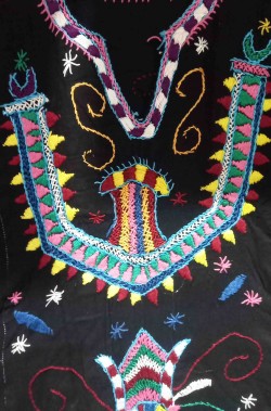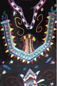 Potrai usarla in casa come comoda vestaglia nera ma anche costruire partendo da lei un originale costume da messicana o un costume da indiana Maya dei tempi aztechi. Costituito dalla lunga tunica nera decorata con mille ricami coloratissimi con figure azteche.