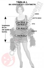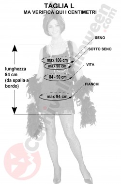 Include il vestito con il fermaglio per i capelli con la piuma cui abbiamo aggiunto noi un lungo boa di piume di struzzo (finte) nero per renderlo completo questo costume anni 20 da donna. Non include tutti gli altri accessori che sono indossati dalla modella a scopo dimostrativo di come si può completare il costume.