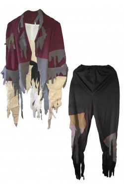 Composto dal gilet con la bandoliera unita, dalla giacca con le parti stracciate ed i pantaloni neri con patch applicate sopra, e' un costume da zombie favoloso.