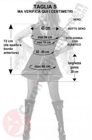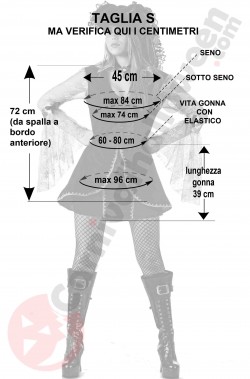 La taglia, unica disponibile, e' dichiarata dal produttore come taglia S ma non fidarti della taglia: misurati e confronta i tuoi centimetri con quelli riportati nella foto in bianco e nero, che abbiamo preso noi sul costume.