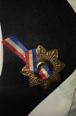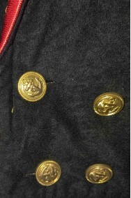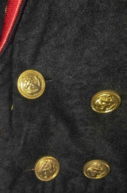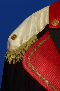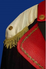 Un abito molto ben fatto che include la lunga giacca a frac con gli stupendi bottoni veri di metallo e la coccarda francese sul bavero, la fascia da legare al collo, i pantaloni alla corsara al ginocchio, i copristivale ed il cappello. La revere rossa della giacca e' di un bel tessuto rosso lucido con bordatura dorata che impreziosisce il costume conferendo realismo.