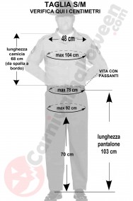 ATTENZIONE: Il costume NON ha una ampia vestibilita'. Veste, circa, dalla S alla M ma NON ti fidare della taglia: misurati con cura e confronta i tuoi centimetri con quelli riportati nella foto in bianco e nero che trovi qui in questa scheda prodotto e che abbiamo preso sul nostro costume, quello a nostro magazzino.